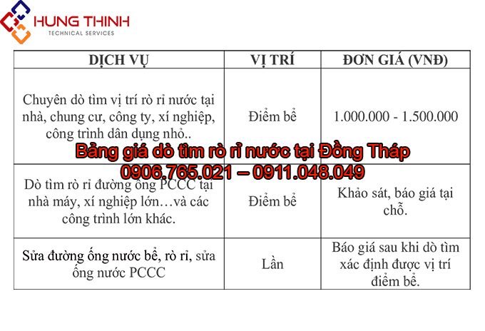 Bảng giá dò tìm rò rỉ nước mới nhất của Điện Nước Hưng Thịnh tại Đồng Tháp: