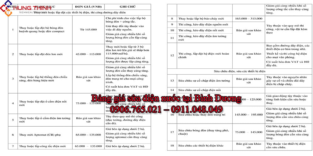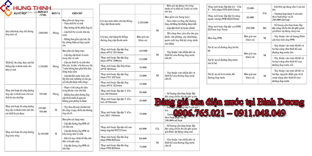 Bảng giá sửa điện nước tại nhà chi tiết nhất Bình Dương của Điện Nước Hưng Thịnh: