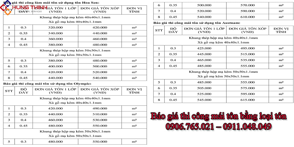 Vì công tác thi công mái tôn tốn kém rất nhiều chi phí nên khách hàng thường rất muốn biết giá lợp mái tôn trước khi thi công. Hiểu được điều đó Hưng Thịnh đã cập nhật và cung cấp báo giá mới nhất mà bạn có thể tham khảo: