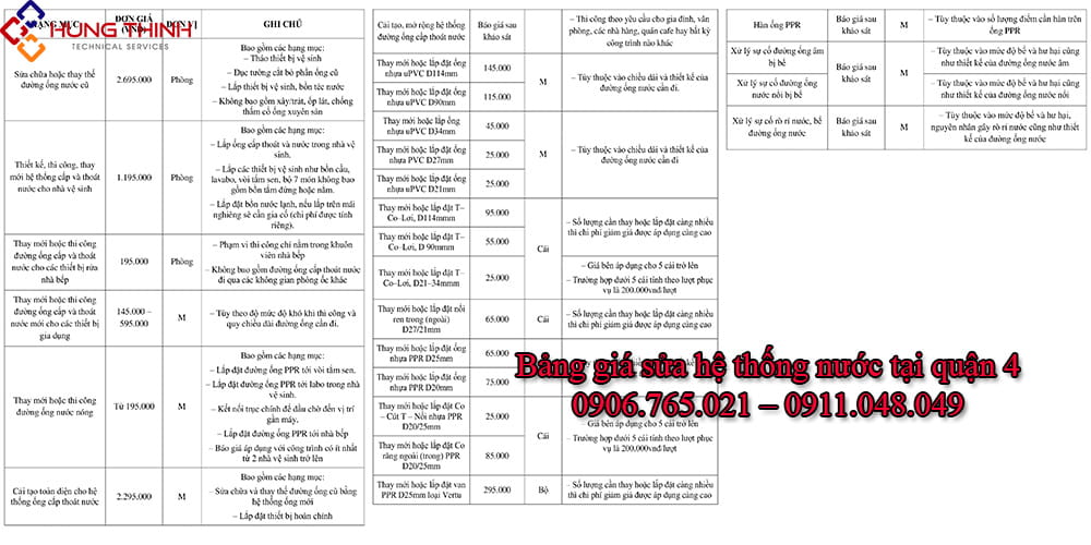 Bảng giá mới nhất về dịch vụ sửa điện nước tại nhà Quận 4 của Điện Nước Hưng Thịnh: