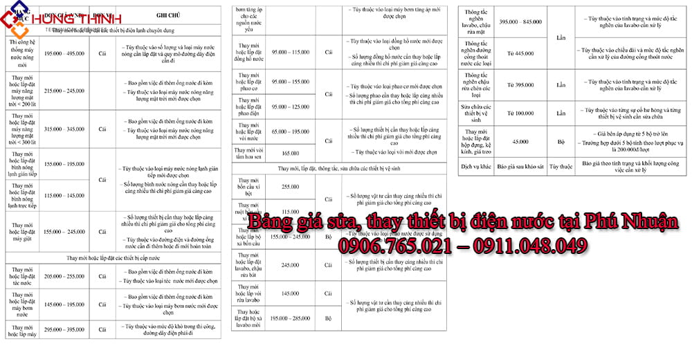 Bảng giá sửa điện nước mới nhất 2025 tại quận Phú Nhuận của Điện Nước Hưng Thịnh: