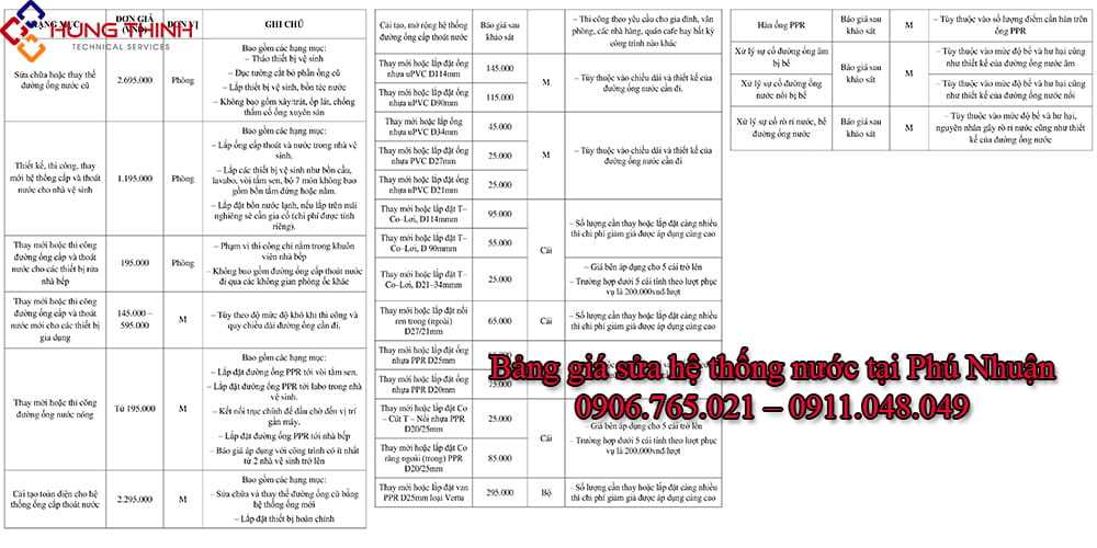 Giá chi tiết về dịch vụ sửa chữa, thay mới, thi công đường ống nước tại Phú Nhuận của Điện Nước Hưng Thịnh: